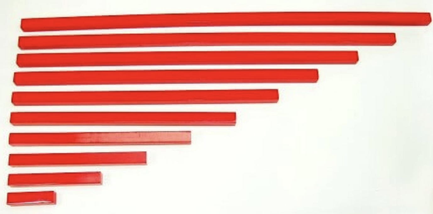 The Red Rods help the child to recognize differences in size in one dimension – length. Again, the child must place the rods in the proper sequence from the smallest which is ten centimeters in length to the largest which is one meter in length. The exercise is similar to the preceding ones in that a mistake in the order is very evident to the child and can be corrected easily. It also offers the teacher the opportunity of introducing to the child the terms–short, shorter, shortest and long, longer, longest. This equipment gives the child a sensorial basis for learning to count when he or she begins mathematics.